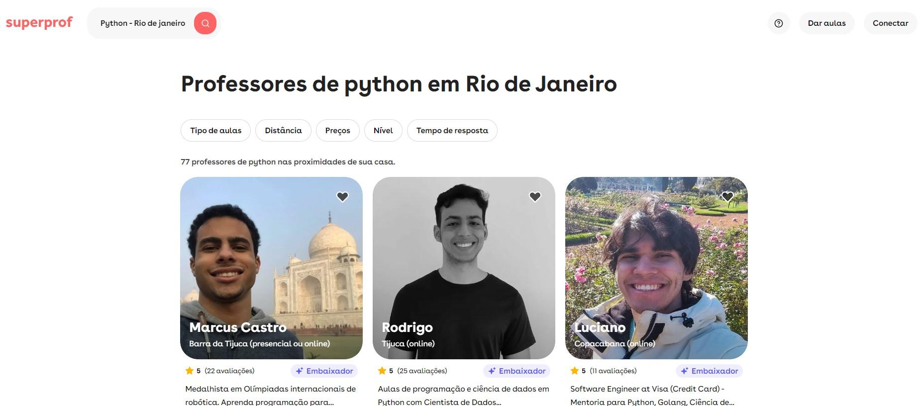 Para encontrar o professor de python ideal, a plataforma Superprof pode ser uma importante aliada. Contamos com diversos professores de python cadastrados na nossa plataforma e a procura pelo melhor tutor pode ser bem simples. Basta aplicar os filtros necessários e em poucos minutos uma lista de profissionais estará a sua frente.
