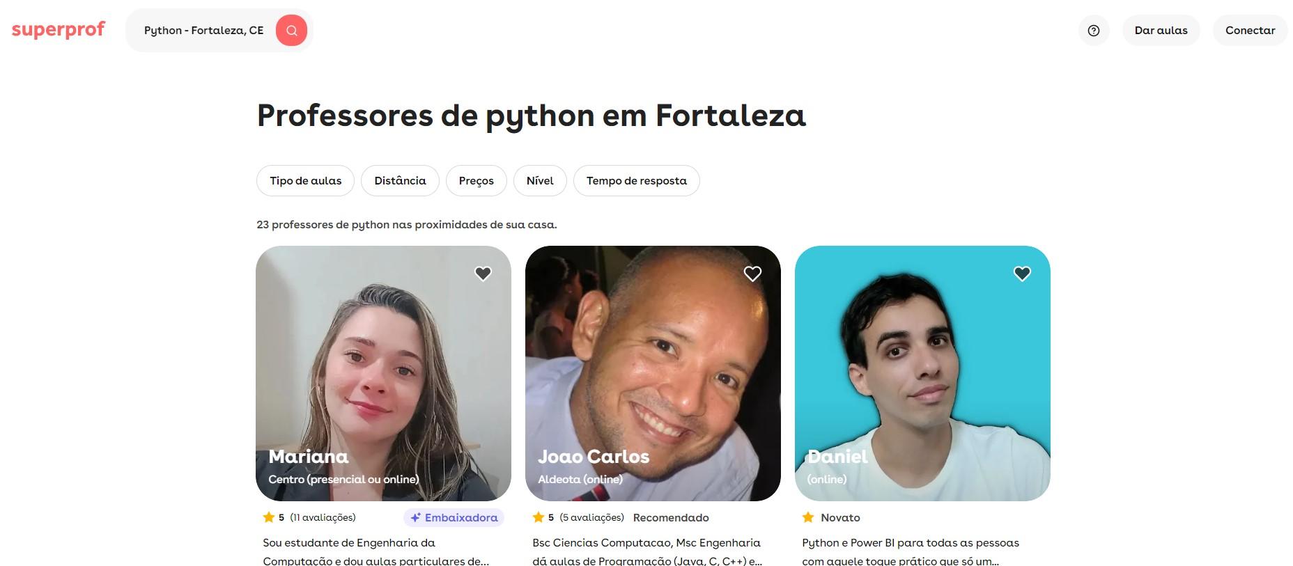 E para encontrar um professor particular de Python ideal às suas necessidades, você pode contar sempre com a plataforma da Superprof. No site da Superprof é possível filtrar os professores da sua região, caso você queira uma aula presencial em Fortaleza, ou ainda professores que fornecem aula online, ampliando assim a sua busca pelo território nacional. Você também pode escolher o seu professor conforme a avaliação dos seus alunos, o preço ou a disponibilidade de horários.