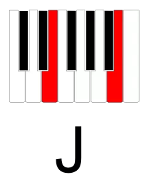 Formato J: São teclas cujo o formato nos lembra a letra J do nosso alfabeto. As teclas que possuem o formato de J são o Mi e o Si. Perceba que o formato de J é a última tecla branca de um grupo de teclas pretas (Sempre depois de uma tecla J teremos uma tecla L, as teclas L servem como guia para começarmos um dos grupos das teclas brancas mencionados acima). Para diferenciar um do outro basta pensar que o Mí está “encostado” no grupo de 2 teclas pretas e o Si está encostado no grupo de 3 teclas pretas.