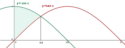 O gráfico do cosseno está acima do gráfico do seno no intervalo de integração.