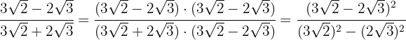 Multiplicamos o numerador e o denominador pelo conjugado do denominador, eliminamos os parênteses no numerador e realizamos a soma por diferença no denominador, o que resulta em uma diferença de quadrados: