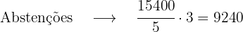 Para saber quanto representa cada parte, observamos que as 5 primeiras partes (a dos votos) somam 15 400; portanto, uma parte será 15400 dividido por 5, o que resulta em 3 080. E as outras três partes (as das abstenções) serão obtidas multiplicando 3 por 3 080.