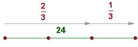 Os 24 anos equivalem a duas partes da idade; então calculamos quanto vale uma parte (24 ÷ 2) e, em seguida, multiplicamos o resultado pelo número total de partes (3).