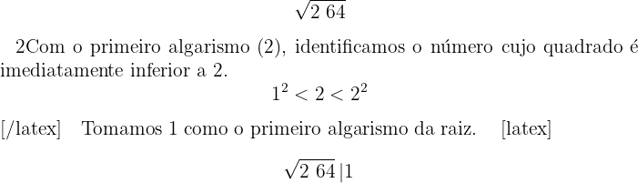 4 Atrás do resto colocamos o grupo seguinte do radicando (64), separamos do número formado o último algarismo à direita (4) e dividimos o que resta (16) pelo dobro do número que temos na raiz, isto é, 2·1 = 2.