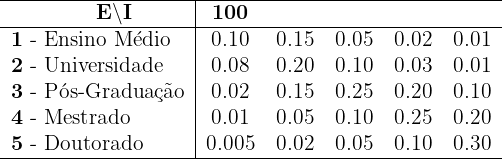 A tabela abaixo mostra a relação entre o nível máximo de escolaridade de um indivíduo e a probabilidade de estar em determinada faixa de renda anual (em milhares de dólares):