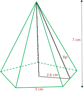 Calcule a área total, o volume e o apótema de uma pirâmide pentagonal com altura de 7 cm, cuja base é um pentágono regular de lado 3 cm e apótema 2,6 cm. Arredonde os resultados para duas casas decimais.