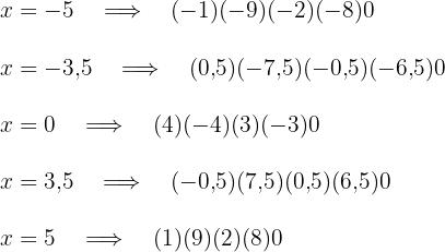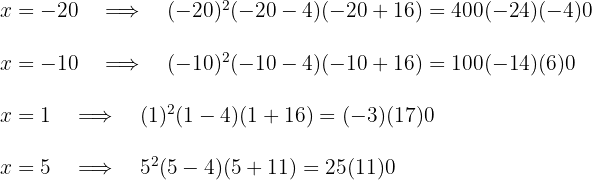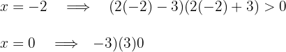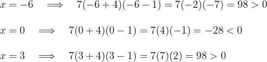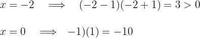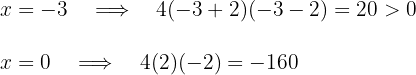 Escolhe-se um ponto de cada intervalo e substitui-se na inequação para verificar o sinal da expressão em cada um. Por exemplo, podemos usar a tríade de valores: