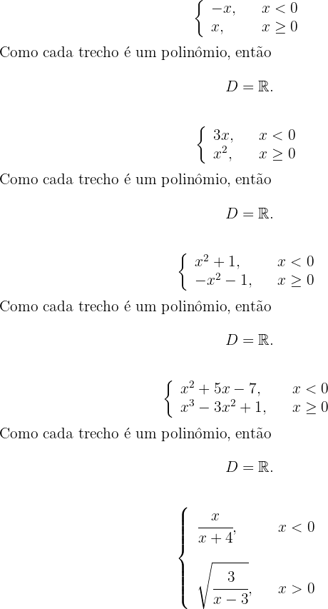 No primeiro trecho, o denominador deve ser diferente de zero. No segundo trecho, como 3 é uma constante sempre positiva, basta garantir que o denominador seja maior que zero.