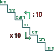 Se quisermos passar de uma unidade para outra, devemos multiplicar (quando passamos de uma unidade maior para outra menor) ou dividir (quando passamos de uma unidade menor para outra maior) por 10 elevado ao número de casas de diferença entre as unidades, ou seja, pela unidade seguida de tantos zeros quantas forem as posições entre elas.