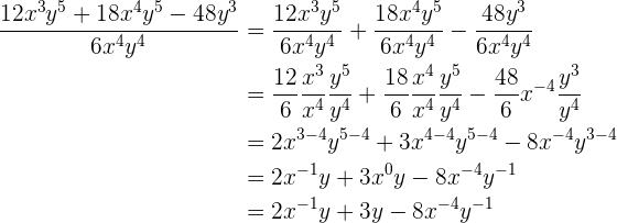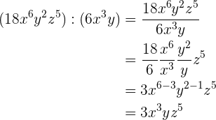 Com os monômios, é muito parecido. Dados dois monômios, ao fazer sua divisão, o coeficiente resultante será a divisão dos respectivos coeficientes, e em relação às variáveis, simplesmente agrupamos aquelas com a mesma base e fazemos suas respectivas divisões. No caso de haver variáveis no numerador que não estejam no denominador, então as transferimos diretamente. No entanto, se houver variáveis no denominador que não estejam no numerador, então as transferimos, mas mudando o sinal do expoente. Assim, por exemplo, vamos considerar os monômios