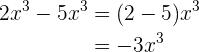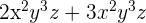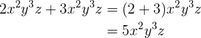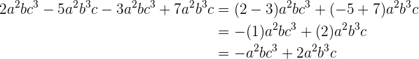 Podemos observar que todos os monômios têm as mesmas variáveis, porém apenas dois monômios têm variáveis com as mesmas potências. Portanto, apenas esses dois podem ser simplificados