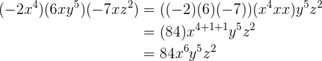 Com os monômios, é muito parecido. Dados dois monômios, ao multiplicá-los, o coeficiente resultante será o produto dos coeficientes respectivos e em relação às variáveis, simplesmente agrupamos aquelas com a mesma base e fazemos seus produtos respectivos. No caso de haver variáveis que apareçam em apenas um monômio, e não no outro, então as transferimos diretamente. Assim, por exemplo, vamos considerar os monômios
