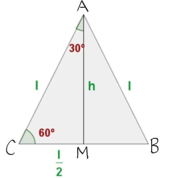 Para obter o valor das razões trigonométricas seno, cosseno e tangente de 30° e 60°, desenhamos um triângulo equilátero com os vértices A, B e C, conforme mostrado na imagem. Como é um triângulo equilátero, cada um dos seus três ângulos mede 60°. Agora, traçamos a altura h dividindo o vértice A pela metade. O resultado nos dá dois ângulos de 30° cada.