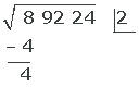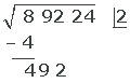 4 Baixamos o seguinte grupo de cifras do radicando, separando do número formado (492) a primeira cifra à direita (2) e dividindo o que sobra entre o dobro da raiz 2, isto é, 2(2)=4.