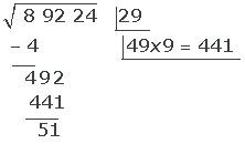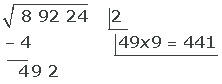 5 Na outra linha debaixo da raiz colocamos o dobro da mesma (4). Depois, colocamos o quociente encontrado (9). Em seguida, o número obtido (49) é multiplicado pelo quociente (9). Por fim, subtraímos (441) pela quantidade operável (492) do radicando.